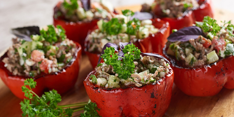 4. Paprike popečemo na žaru, nato pa vsako napolnimo s prej pripravljenim nadevom in postrežemo.