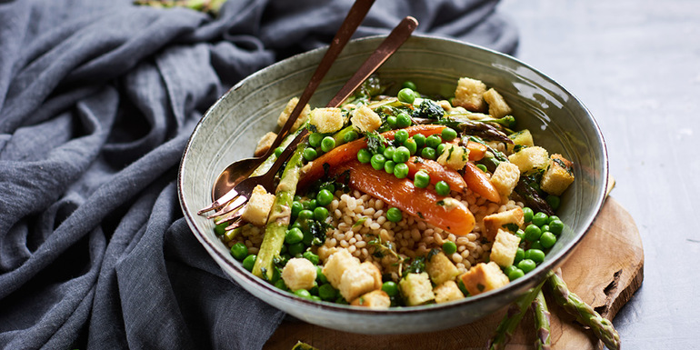 3. Na servirni krožnik stresemo ješprenj in nanj položimo pečene šparglje s korenjem, potresemo s svežim grahom, prelijemo s prelivom ter posujemo s popečenimi kruhovimi kockami.
