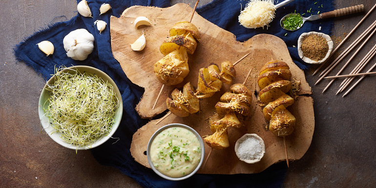 1. Krompirje dobro operemo in vanje zapičimo lesene palčke za ražnjiče.