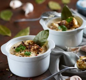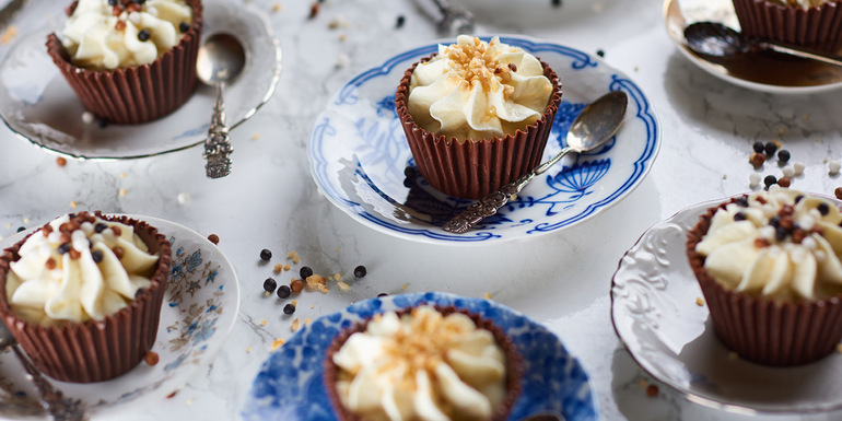 7. Čokoladnim lončkom odstranimo papir, jih napolnimo s kremo iz bele čokolade, kave in sira maskarpone.