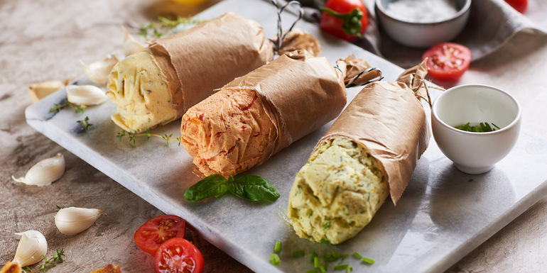 3. Najprej naredimo paradižnikovo maslo: paradižnik, baziliko in ščepec soli zmešamo s pomočjo sekljalnika. Dodamo tretjino masla in mešamo tako dolgo, da se vse sestavine povežejo. Posodico speremo in pripravimo maslo s papriko: papriko olupimo, drobnjak nasekljamo in dodamo še ščepec soli. Ponovimo isti postopek kot prej. Ostane še česnovo maslo: česen iztisnemo iz lupinic, naribamo limonovo lupinico, posolimo in zmešamo, nato dodamo še zadnjo tretjino masla ter ponovno