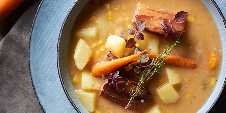 Hamburško panceto dobro prepražimo in dodamo nasekljano čebulo ter pražimo, da postekleni, dodamo vso zelenjavo in krompir (3/4 velikih kosov in 1/4 manjših, da krompir razpade), vse skupaj zalijemo z litrom vode ali juhe ter kuhamo 45 minut, na koncu dodamo paradižnikovo mezgo ter pokusimo in začinimo.