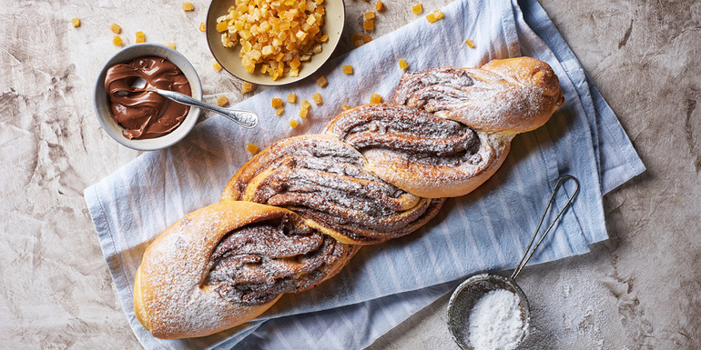 4. Vzhajano testo razvaljamo na pravokotnik, premažemo s čokoladnim namazom, posujemo z marcipanom in kandirano pomarančo ter zvijemo kot potico. Zvitek prerežemo podolgem (pri vrhu ga ne prerežemo do konca), trakova obrnemo tako, da se vidi čokoladni prerez, nato pa ju prepletemo enega čez drugega.