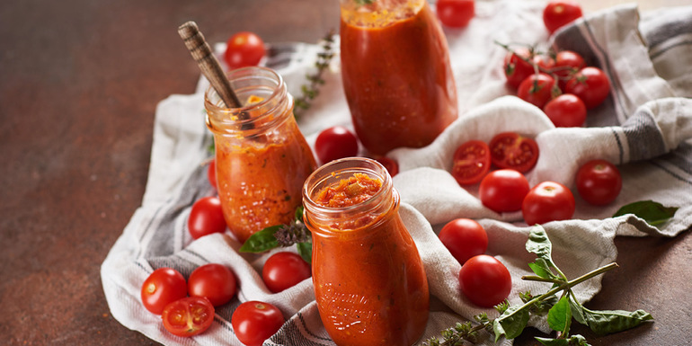 5. Ko so paradižniki popečeni, jih dodamo prepraženi zelenjavi, dodamo še baziliko ali timijan, pomešamo, spasiramo s paličnim mešalnikom in še malce pokuhamo do želene gostote.