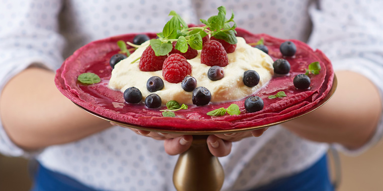 3. Vsako palačinko namažemo sirom maskarpone, ki smo mu primešali agavin sirup, posujemo z borovnicami in zvijemo v trikotnik.