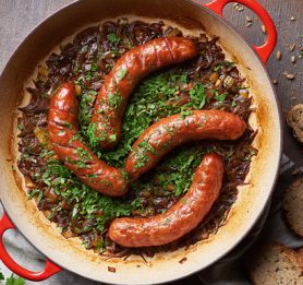 4. Na bagetine rezine položimo medaljone svinjske ribice, bogato obložimo s kajmakom in kalčki.