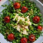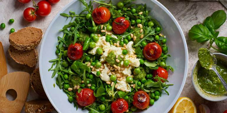 3. Rukolo, motovilec, grah in paradižnik razporedimo po večjem krožniku ali