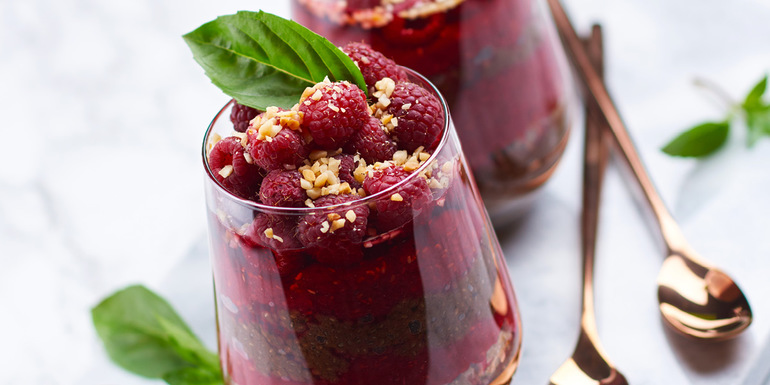 5. Obe masi v plasteh razporedimo po kozarčkih in okrasimo s svežim sadjem.