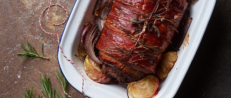 5. Pečenko pečemo najprej 15 minut na 230 stopinjah, preostali čas pa na 200 stopinjah. Velja pravilo, da 1 kg svinjskega mesa pečemo 1 uro, najbolje pa se je držati priporočene središčne temperature: svinjina je pečena pa pri središčni temperaturi 70 stopinj. Pečenko lahko tudi vsakih 15 minut polijemo z lastnim sokom ali malce vina.