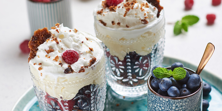 4. Elemente sladice zlagamo v kozarčke po plasteh: najprej drobljenec, nato sadje in kremo. Ponovimo, da zapolnimo kozarce.