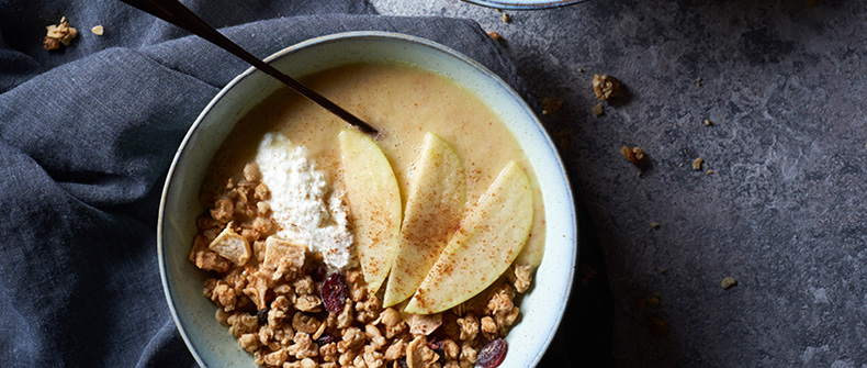 2. Smuti prelijemo na globoke krožnike ali v sklede za misli. Dodamo žlico ali dve skute z grškim jogurtom, zraven naredimo stezico iz granole, dodamo lično narezane rezine jabolka, posujemo s cimetom in pokapljamo z medom.