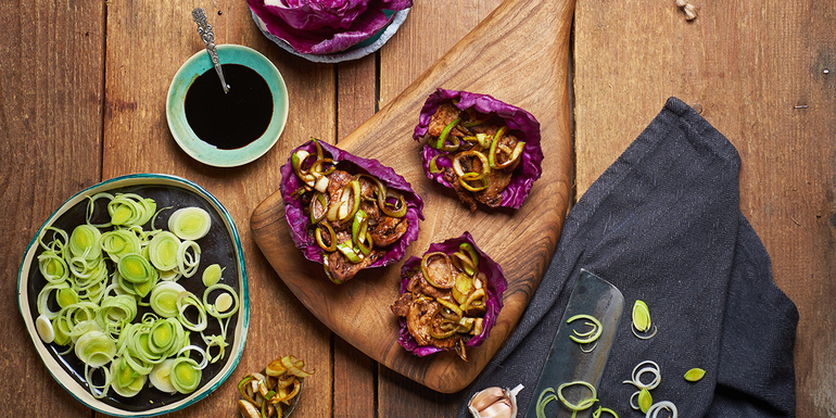 5.Tako pripravljeno svinjsko ribico serviramo v čolničkih iz listov rdečega zelja ali solate.