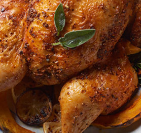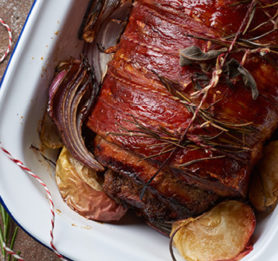 3. Meso obvežemo z vrvico, da dobimo lepo okroglo obliko. Na vroči ponvi ga opečemo z vseh strani. Meso predenemo na krožnik.