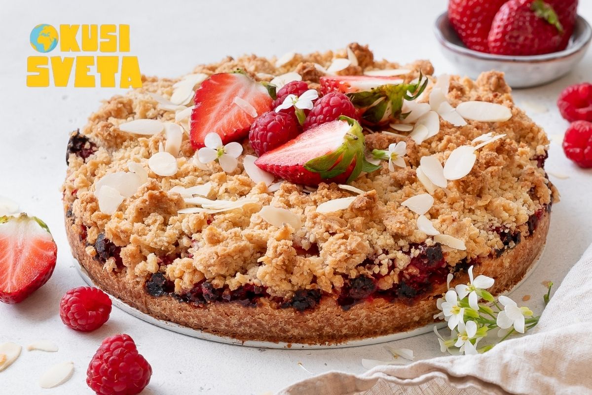 - Po vrhu razdrobi preostanek testa in daj v pečico za približno 25 min.