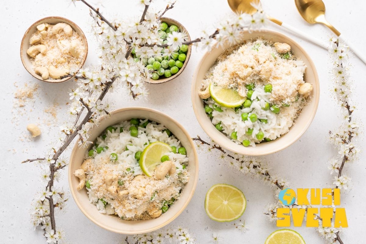 - Riž stresi v skledo ter ga potresi s kokosom in indijskimi oreščki ter postrezi.
