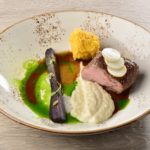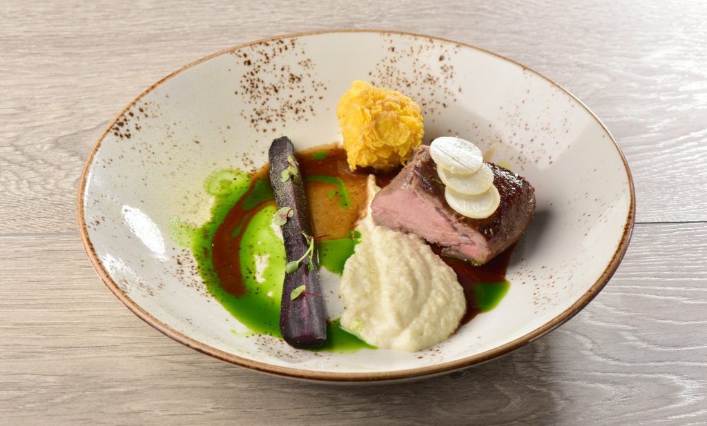 V mrenki pečen hrbet divjega prašiča s temno omako podzemne zelenjave, ocvrt olbič, pire gomolja zelene, pečen korenček, okisan koren peteršilja, olje peteršilja