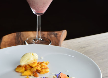 Carski praženec z glaziranim korenčkom po ljubljansko, mouss kisle smetane in skute, flambirane borovnice, espuma mete in limete ter vaniljev sladoled s cvetovi bezga.