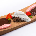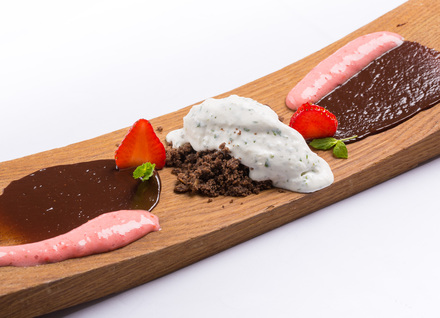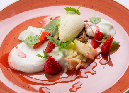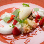 Ime sladice: Mousse kisle smetane in skute, z melisino espumo, karameliziranimi jabolki, vaniljevim sladoledom in jagodno omako