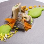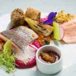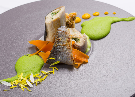 Rulada iz postrvi s čemažem in mariniranimi drobtinami, rožmarinovo maslo, grahov pire, korenčkov kipnik z zelišči, korenčkov kaviar, sortirani korenčkovi in kolerabni olupki, čemaževa omaka, pire rdečega korenja, regratova podlaga, hrustavec s pastinakom in zelišči