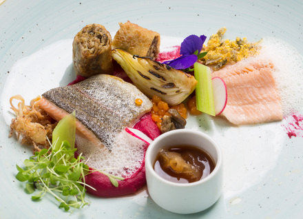 Pečen in poširan file rdeče postrvi, pire zelene s sokom rdeče pese, štruklji s polžjim nadevom in drobtinami ribje kože, ocvrto kislo zelje, popečen koromač, stebelna zelena, korenčkove kapljice, limonina pena in šalotkin prevretek