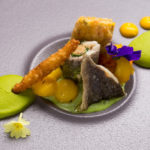 Rulada iz postrvi s čemažem in mariniranimi drobtinami, rožmarinovo maslo, grahov pire, korenčkov kipnik z zelišči, korenčkov kaviar, sortirani korenčkovi in kolerabni olupki, čemaževa omaka, pire rdečega korenja, regratova podlaga, hrustavec s pastinakom in zelišči