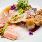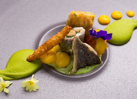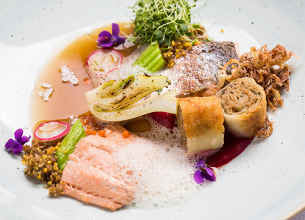 Pečen in poširan file rdeče postrvi, pire zelene s sokom rdeče pese, štruklji s polžjim nadevom in drobtinami ribje kože, ocvrto kislo zelje, popečen koromač, stebelna zelena, korenčkove kapljice, limonina pena in šalotkin prevretek