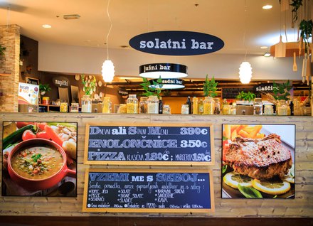 Sodobna Restavracija Tuš svojim gostom ponuja možnost, da si sami sestavijo svoj meni, ki ustreza njihovemu trenutnemu razpoloženju in žejam. Po svojem okusu lahko tako zadovoljijo potrebo po hitrem, a hkrati tudi kakovostnem obroku, ali počasi uživajo v kulinaričnih dobrotah. Izbirajo lahko med pestro ponudbo juh in okusnih enolončnic, sestavijo solato iz bogato obloženega solatnega bara, ki jo odlično izpopolnijo z različnimi prelivi, si postrežejo v sadnem baru s svežim in izberejo svež naravni sok ali tortico iz vitrine. Tuševi kuharji dodatno skrbijo za pripravo dnevno svežih malic in kosil, pa tudi okusnih pic za vse, ki jim primanjkuje časa in pričakujejo hitro pripravljen polnovredni obrok.
