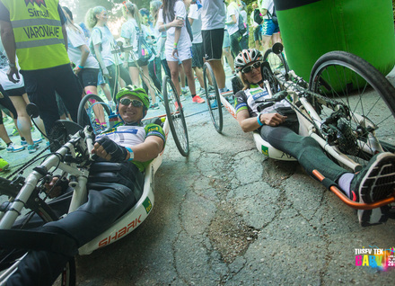 »Gibanje, zabava, druženje – to so stvari, v katerih lahko uživamo vsi. Prav zato smo se Tuševemu teku barv pridružili tudi športniki invalidi, saj za dobro voljo ni ovir. Danes smo si prav vsi zaslužili kolajno, nenazadnje pa tudi pošteno zabavo.« je sta ob prihodu v cilj poudarila David Razboršek in Anka Vesel, pobudnika akcije Zavrtimo Slovenijo, v okviru katere letos širijo sporočilo o pomenu gibanja med invalidi. Pri tem jih so jih podprli v Tušu, saj so del sredstev namenili nakupu ročnega kolesa za izposojo na Inštitutu RS za rehabilitacijo Soča. S tem želijo motivirati invalide in jim prek motivacijskih kampov omogočiti kakovostne začetke aktivnega športnega življenja.
