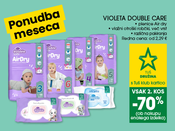Člani Tuš družine lahko od3. do 29. 11. 2025ob nakupuplenic in vlažnih otroških robčkov Violeta Double Careprihranite kar70 %!Akcija velja za vsak 2. kos ob nakupu enakega izdelka.