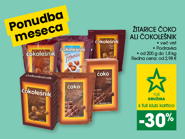 Člani Tuš družine lahko decembražitarice Čoko in Čokolešnikkupujete kar30 % ceneje. Ponudba velja ekskluzivno za člane Tuš družine od1. do 31. 12. 2025, popust pa se ob predložitvi Tuš klub kartice obračuna pri blagajni.
