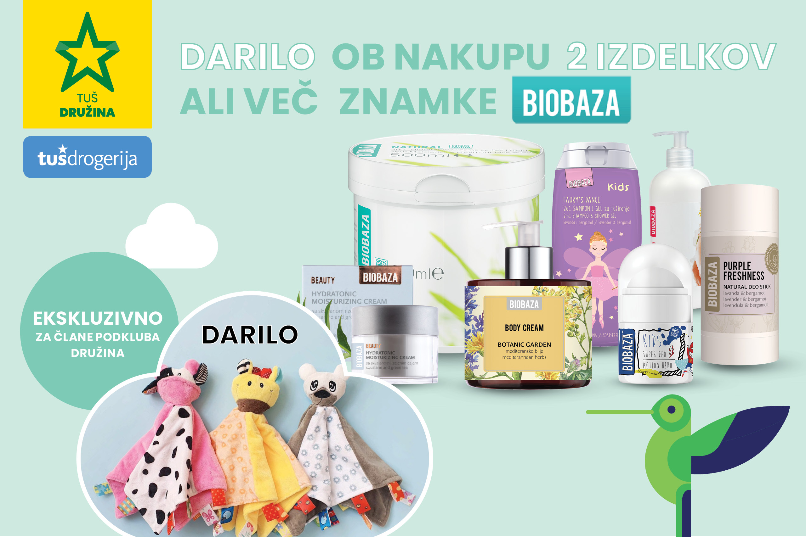 Za člane podkluba Tuš družina smo pripravili ekskluzivno ugodnost, ki velja v vsehTuš drogerijah. Ob nakupu katerih koli 2 izdelkovBIOBAZAprejmeteDARILO– mehko ninico za svojega malčka ali malčico.