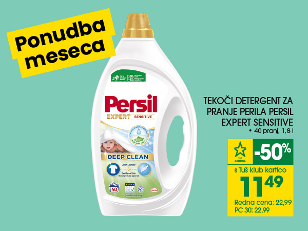 Člani Tuš družine lahko oktobra Tekoči detergent za pranje perila Persil Expert Sensitive (40 pranj, 1,8 l) kupujete kar 50 % ceneje! Akcija velja ekskluzivno za člane Tuš družine od 1. do 30. 10. 2025, popust pa se ob predložitvi Tuš klub kartice obračuna pri blagajni.