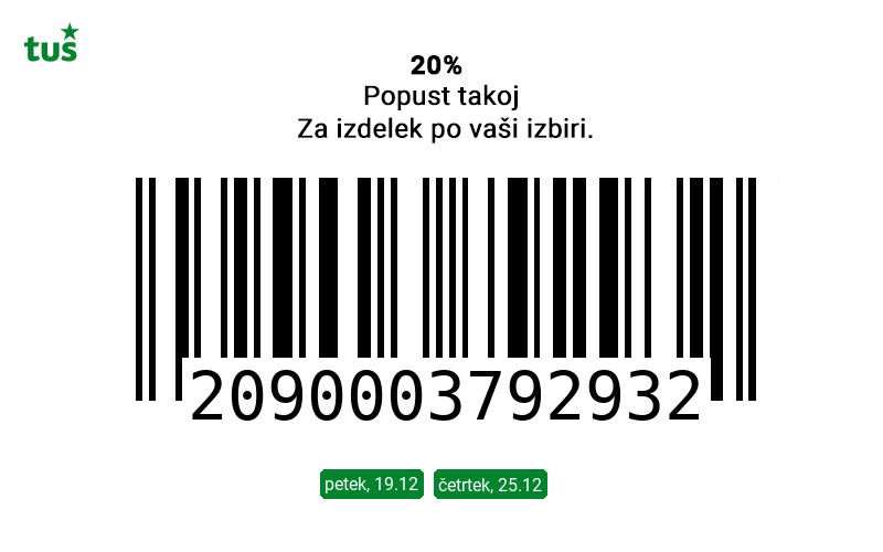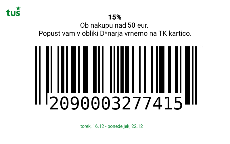 Unovčite lahko 1 kupon za 1 nakup z 1 Tuš klub kartico ali Diners Club Tuš kartico (ali iz letaka ali iz e-obveščanja ali iz mobilne aplikacije). Kupon je unovčljiv ob nakupu nad 50 € v trgovinah in franšizah Tuš. V pogoj 50 € se ne šteje nakup tobačnih izdelkov in pripomočkov, nakup darilnih kartic in plačilo položnic. Popust se naloži kot D*NAR na Tuš klub kartico. Stranka je dolžna pri blagajni opozoriti o uveljavitvi kupona pred zaključkom računa. Kasnejših reklamacij ne upoštevamo. Ista oseba ne more opraviti več zaporednih nakupov z več Tuš klub karticami. D*NAR se obračuna samo na izdelke z redno ceno. Ne velja na izdelke z akcijsko ceno, na izdelke iz ponudbe za KRATEK ČAS in SUPER CENA, iz odprodaje, znižane pred iztekom roka uporabe, izdelke, pri katerih je v promocijskih materialih pripisano, da se nanje ne obračunajo dodatne ugodnosti in izdelek, za katerega se uveljavlja kupon za izdelek po izbiri (kupon 25 % za izbrani izdelek). D*NAR se prav tako ne obračuna za časopise in revije, knjige, cigarete, tobačne izdelke in pripomočke, kartice in predplačniške pakete mobilnih operaterjev, vrednostnice za mobilne telefone, za začetne formule, povratno embalažo, plačilo položnic, nakup darilnih bonov ali vrednostnih kartic, za darilne pakete Zvezdar in Select Box, za pelete, plin v plinskih jeklenkah in za plinske jeklenke. V primeru obročnega odplačevanja kupona ni mogoče uveljavljati. Kupon ne velja za pravne osebe in samostojne podjetnike posameznike. Pri nakupu se lahko izkoristi samo ena ugodnost za nakup (popust ne velja na druge popuste za nakup oz. se z njimi izključuje). D*NAR se ne obračuna pri nakupu izdelkov v franšiznih mesnicah, ki jih le-te dajejo v najem. Kupon ni unovčljiv v spletnem supermarketu hitrinakup.com.