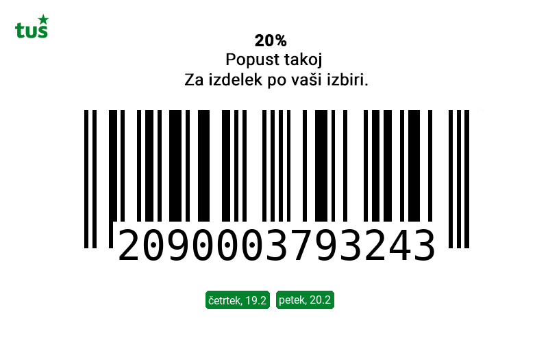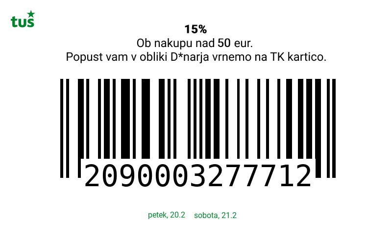 Unovčite lahko 1 kupon za 1 nakup z 1 Tuš klub kartico (ali iz letaka ali iz e-obveščanja ali iz mobilne aplikacije). Kupon je unovčljiv ob nakupu nad 50 € v trgovinah in franšizah Tuš. V pogoj 50 € se ne šteje nakup tobačnih izdelkov in pripomočkov, nakup darilnih kartic in plačilo položnic. Popust se naloži kot D*NAR na Tuš klub kartico. Vrednost nakupa ni omejena, maksimalni možni znesek naloženega D*NAR-ja je 500 €. Stranka je dolžna pri blagajni opozoriti o uveljavitvi kupona pred zaključkom računa. Kasnejših reklamacij ne upoštevamo. Ista oseba ne more opraviti več zaporednih nakupov z več Tuš klub karticami. D*NAR se obračuna samo na izdelke z redno ceno in se ne obračuna na akcijske izdelke, na že aktivirane izdelke iz akcije Mojih 10, izdelke iz Bum in Tuš klub - 50 % ponudbe, iz ponudbe ZA KRATEK ČAS, iz lojalnostnih programov, iz odprodaje, izdelke z oznako SUPER CENA, izdelke, znižane pred iztekom roka uporabe, izdelke, pri katerih je v promocijskih materialih pripisano, da se nanje ne obračunajo dodatne ugodnosti in izdelek, za katerega se uveljavlja kupon za izdelek po izbiri (kupon 25 % za izbrani izdelek). D*NAR se prav tako ne obračuna za časopise in revije, knjige, cigarete, tobačne izdelke in pripomočke, kartice in predplačniške pakete mobilnih operaterjev, vrednostnice za mobilne telefone, za začetne formule, povratno embalažo, plačilo položnic, nakup darilnih bonov ali vrednostnih kartic, za darilne pakete Zvezdar in Select Box, za pelete, plin v plinskih jeklenkah in za plinske jeklenke. V primeru obročnega odplačevanja kupona ni mogoče uveljavljati. Kupon ne velja za pravne osebe in samostojne podjetnike posameznike. Pri nakupu se lahko izkoristi samo ena ugodnost za nakup (popust ne velja na druge popuste za nakup oz. se z njimi izključuje). D*NAR se ne obračuna pri nakupu izdelkov v franšiznih mesnicah, ki jih le-te dajejo v najem.