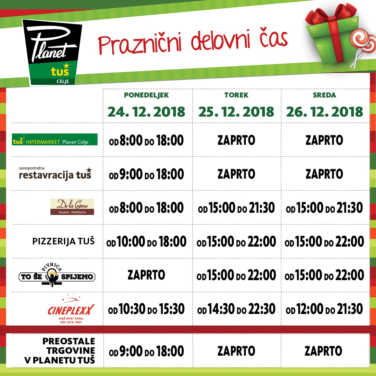 Objavljamo delovni čas za 24., 25., in 26. decembra.