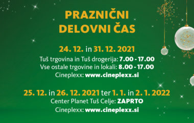 Spoštovani obiskovalci, obveščamo vas, da bo Planet Tuš Celje v petek, 24.12 in 31.12.2021 odprt po spodnjem delovnem času: Tuš trgovina in Tuš drogerija: od 7.00 do 17.00 Vse ostale trgovine in lokali: od 8.00 do 17.00 Cineplexx: delovni čas na: www.cineplexx.si. 25. 12. IN 26. 12. 2021 TER 1. 1. … Več