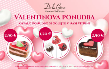 V kavarni in slaščičarni De La Créme so za naše goste pripravili posebno valentinovo ponudbo. Pridite v Planet Tuš Celje že danes in se posladkajte s torticami ali drugimi dobrotami! Ponudba velja le do 16. 2. 2022, zato je ne zamudi!