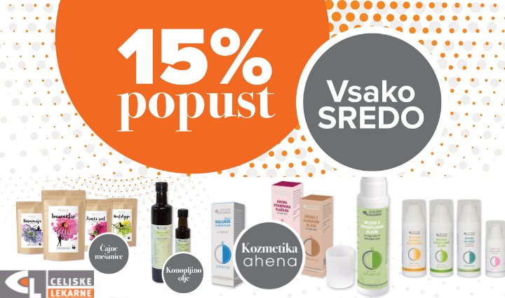 Spoštovani obiskovalci, vsako sredo vam v Celjskih lekarnah priznamo 15% popust na izbrane izdelke Galenskega laboratorija Celjskih lekarn.