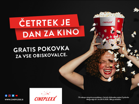 Ob nakupu vstopnice za predstave v kinu Cineplexx v četrtek obiskovalec prejme S pokovko. Akcija velja od 1. do 29.10.2020.