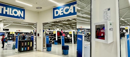 Na steni pred vhodom v trgovino DECATHLON je nameščen prenosni avtomatski eksterni defibrilator (AED).