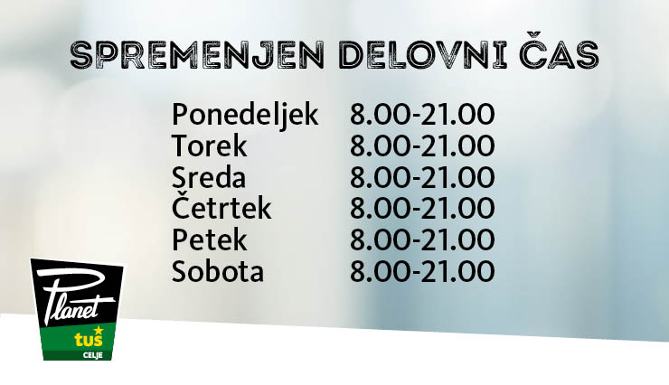 Od ponedeljka, 29.3.2021, bo Planet Tuš Celje odprt po spremenjenem odpiralnem času.