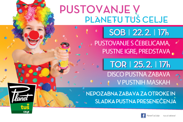 Nepozabno pustovanje za otroke v Planetu Tuš Celje. Na pustovanju ne bo manjkalo nore zabave, pustnih iger, sladkih presenečenj.