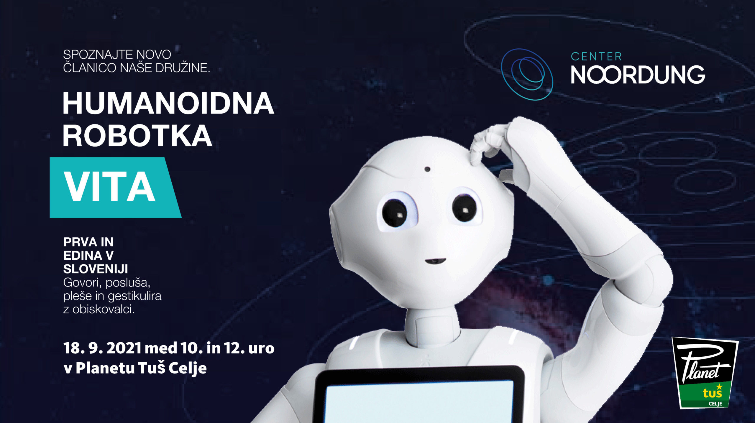 V soboto, 18. 9. 2021, med 10. in 12. uro, se bo v Planetu Tuš Celje, v sklopu razstave Centra Noordung, v živo predstavila robotka Vita.